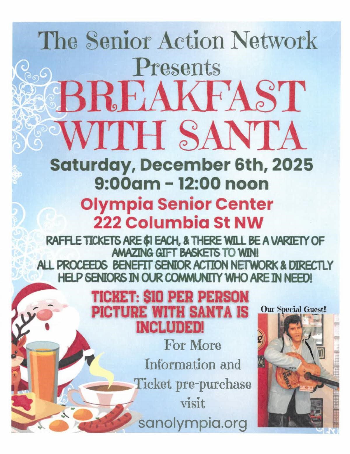 Help our Seniors stay safe and warm this winter and have Breakfast with Santa!! Suggested donation of $10 includes a picture with Santa. Hosted by the Senior Action Network (SAN) at the Olympia Senior Center. 222 Columbia St. NW, Oly WA 98501 All proceeds help seniors in our community who are in need!