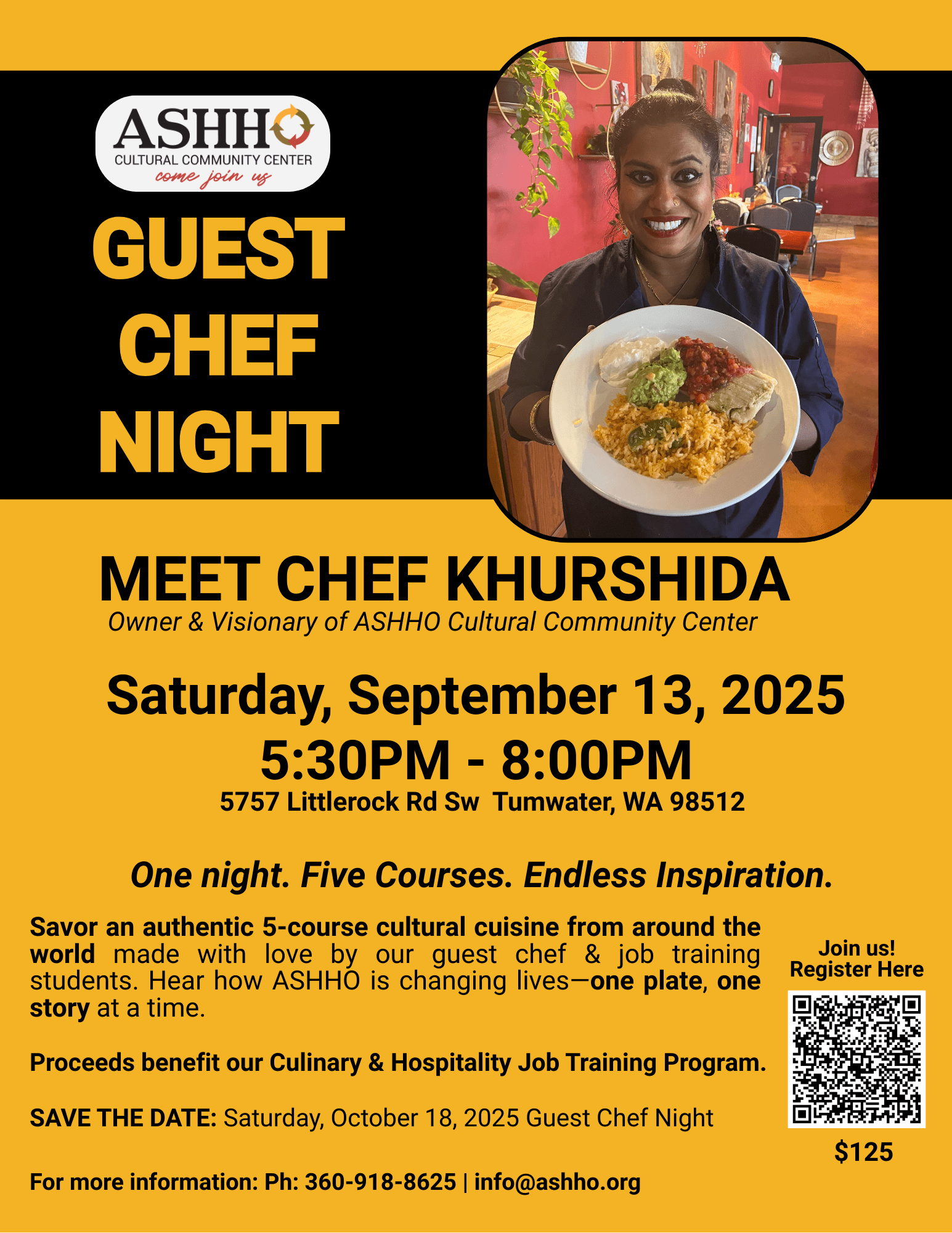 ASHHO is thrilled to present our very first Guest Chef Night, featuring the unstoppable Chef Khurshida, on Saturday, September 13 from 5:30 PM – 8:00 PM.